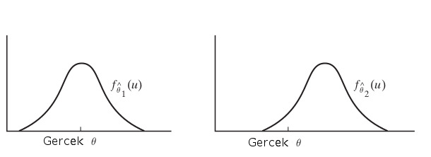 Bu durumu şöyle açıklayalım, madem tahmin ediciler birer rasgele değişken, o zaman bir dağılım fonksiyonları var. Ve üstteki resimde örnek olarak \(\hat{\theta_1},\hat{\theta_2}\) olarak iki tahmin edici gösteriliyor mesela ve onlara tekabül eden yoğunluklar \(f_{\hat{\theta_1}}, f_{\hat{\theta_1}}\). İdeal durum soldaki resimdir, yoğunluğun fazla olduğu yer gerçek \(\theta\)’ya yakın olması. Bu durumu matematiksel olarak nasıl belirtiriz? Beklenti ile!