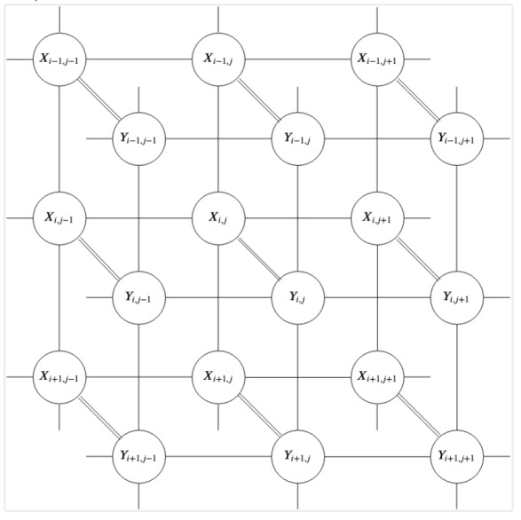 Yukarıdaki grafik bu ilişkiyi özetlemektedir. Her \(x_{i,j}\) düğümü (ki bir olasılıksal değişken), doğrudan gözlemlediğimiz gürültülü pikseli temsil eder. Her \(y_{i,j}\) düğümü ise bulmak istediğimiz gizli, temiz pikseli temsil eder. İki katman ayrı tutulmuştur: X düğümleri bağımsız gürültü kanalları aracılığıyla karşılık gelen Y düğümlerine bağlanırken, Y düğümleri kendi aralarında yatay ve dikey komşuluklar boyunca birbirine bağlıdır. Bu ikinci bağlantı kümesi kritiktir — doğal görüntülerin yerel olarak düzgün olma eğiliminde olduğu, yani komşu piksellerin birbirine yakın değerler alması gerektiği inancını kodlar. Olasılıksal açıdan düğüm (değişken) arasındaki bağlantılar bir koşulsal olasılık ilişkisini ima eder.